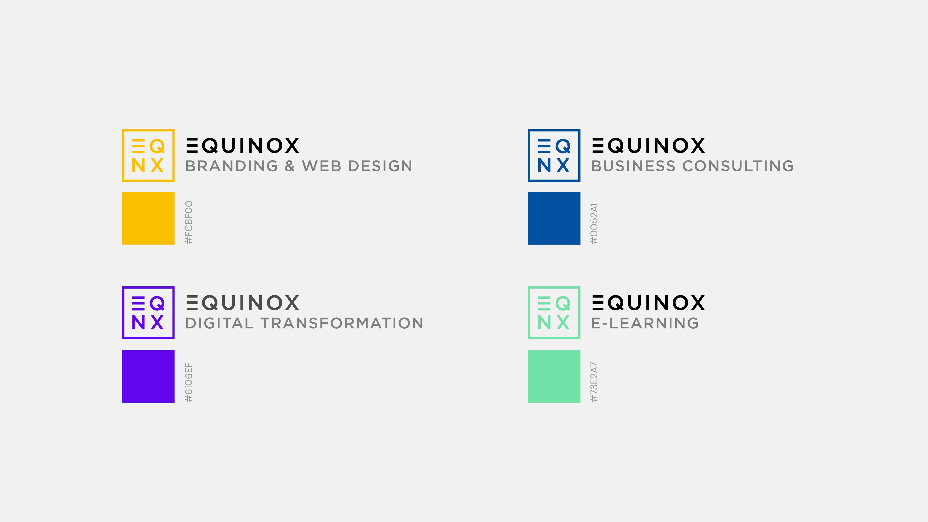 To support Equinox during a restructuring, I modernised their branding by creating a cohesive visual identity that features a refreshed main logo and four distinct sub-logos and colour schemes to represent their expert sectors.